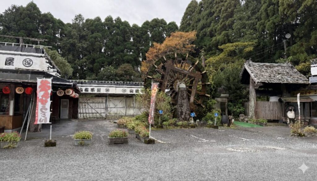 この水車は山椒茶屋のシンボルとして長く親しまれ、ドライブ中でもひときわ目立つ存在だ。