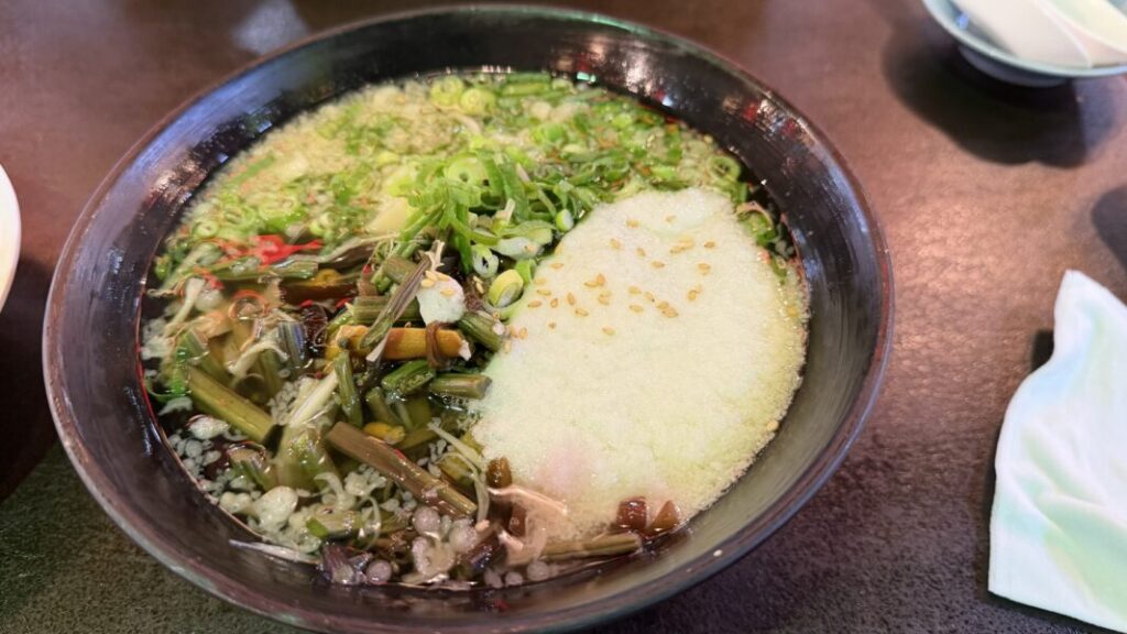 人気の山菜そばは、地元らしい素朴な味わいで、自然と調和した山椒茶屋らしいメニューだ。